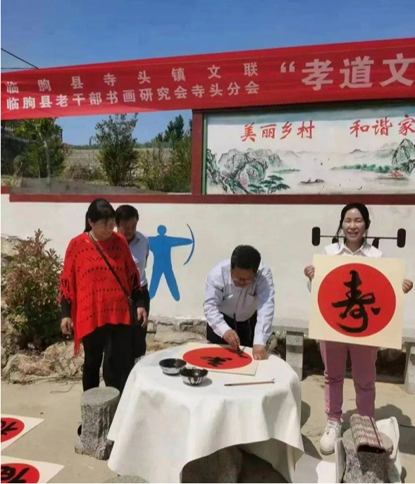 5月11日上午,临朐县组织老干部书画研究会部分会员来到寺头镇西吕匣村开展以尊老敬老为主题的“孝道文化”进农村活动,祝福天下的母亲健康平安长寿!这次活动也是积极开展“深入生活、服务人民”的文艺惠民活动,把高雅艺术送到群众中去,使传统经典艺术走进基层、贴近群众。